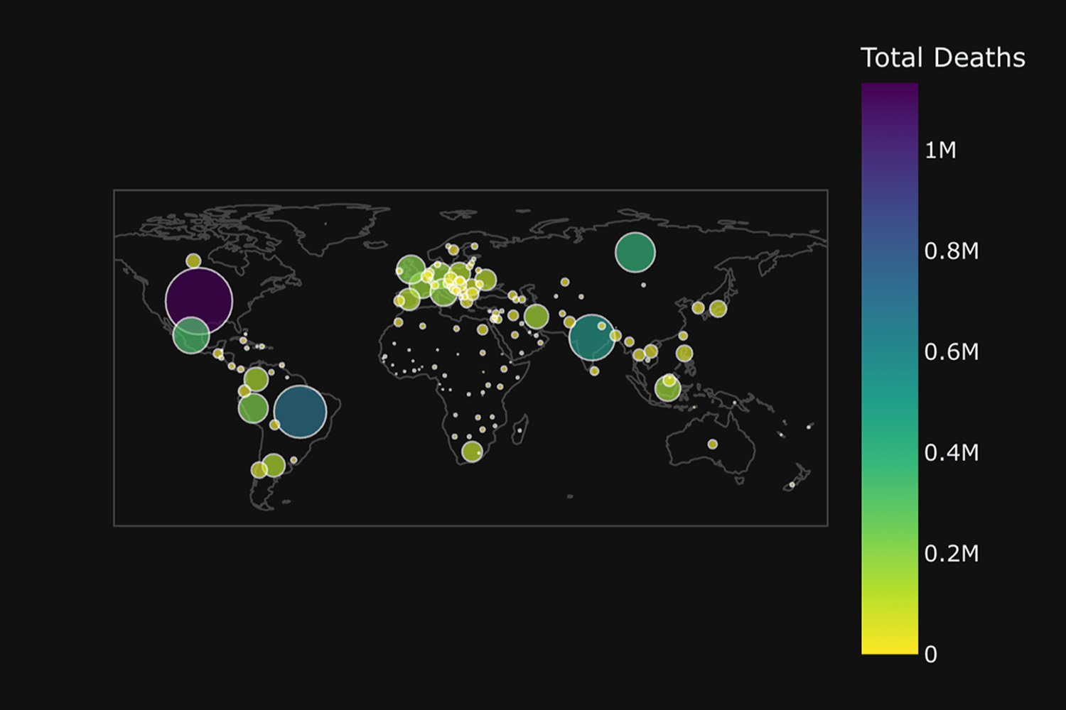 We visualized the total number of cases and deaths caused by Covid-19 in countries on the world map, and to compare these with these countries' deaths-to-cases ratio.