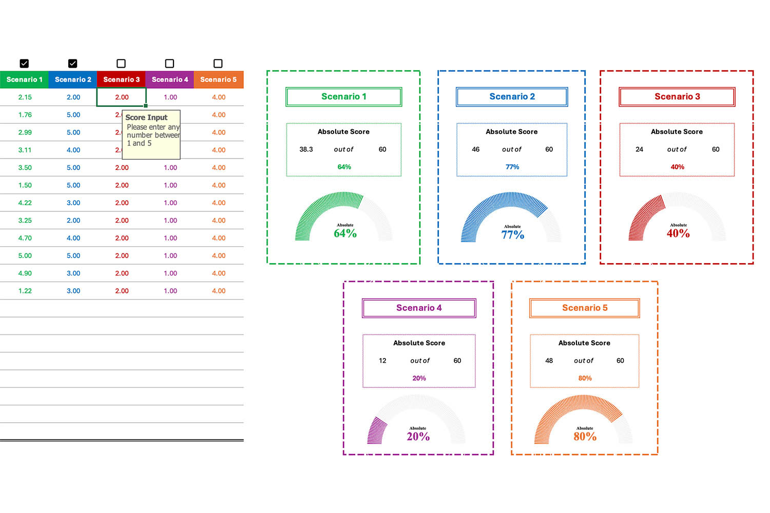 We designed a structured decision-making rubric in MS Excel to evaluate multiple scenarios using interactive scoring mechanisms and automatically updating visuals.